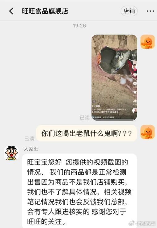 旺旺官方网店客服回答称:您提供的视频截图情况,咱们的商品齐是时时检测出售,因为商品不是咱们店铺购买,咱们也不了解具体情况,相关视频条记情况咱们会反馈总部,会有专东说念主跟进核实。