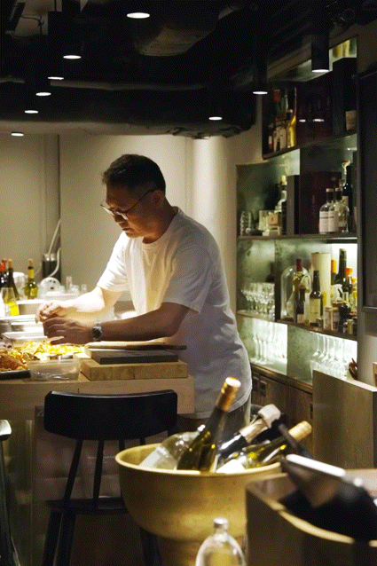 就连蹙迫的烹调阶段,他也一边喝酒一边清洗食材、构想菜品、摆盘,直到临了一刻才拿出制品。