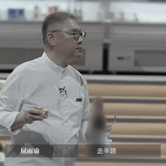 当年青厨师们为争夺最好机位而调动姿势时,他却在推着餐车玩“碰碰车”,与年青选手轻轻相撞,脸上披露出孩子般的笑貌。