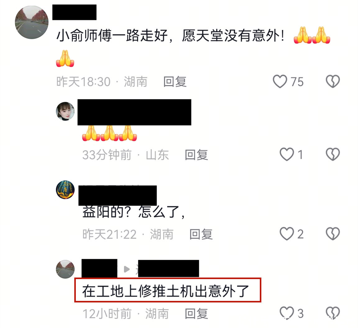 不外湖南当地网友泄漏,小俞师父是在工地上修推土机出现不测离世的。