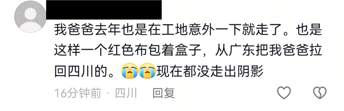 有一位网友看到小俞师父物化的音书惊叹,他的爸爸旧年亦然在工地上一下就走了,亦然这么的一个红色布包着盒子,他说从广东把爸爸拉回四川,于今莫得走出暗影。