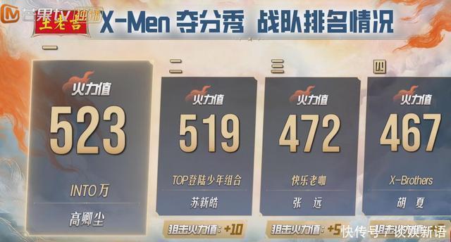 高卿尘第又名523火力值,苏新皓第二名519火力值,张远第三名472火力值,胡夏第四名467火力值。 看到这个火力值之后,我认为口角常不屈允的。 换句话说,这个赛制策画得是超过不屈允的。