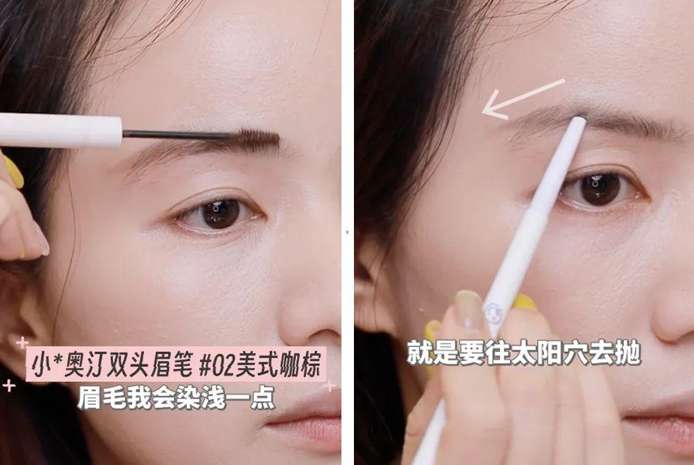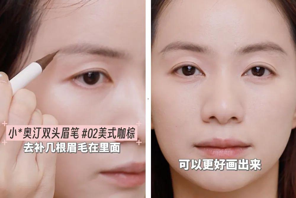 这么画完后, 眉尾不够有连贯性,我会再用小奥汀的双头眉笔#02好意思式咖棕去补几根眉毛在内部, 再用眉刷晕染一下,眉尾就像长出来似的。
