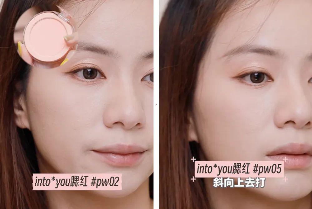 肖似intoyou单色腮红#pw02,橘调会骄矜出皮肤的健康充足感;肖似同系列#pw05,斜朝上去打上这个中性色,增多面部折叠度。