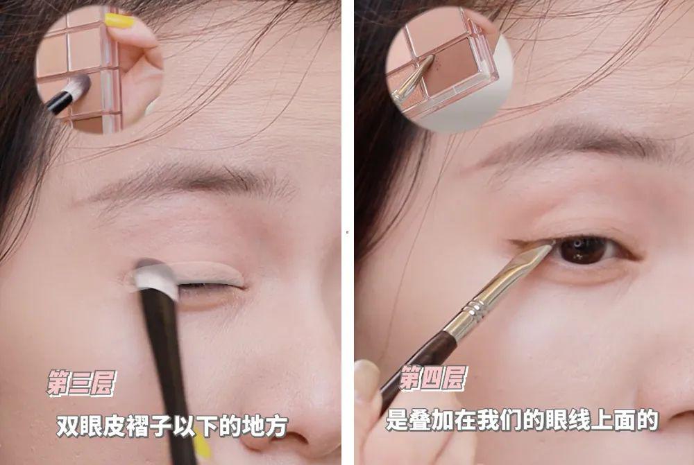 第一层的脸色规模是眼窝以下, 第二层在 双眼皮褶皱脚下到眼睑, 第三层 加深 双眼皮褶子以下, 第四层 肖似在眼线上。