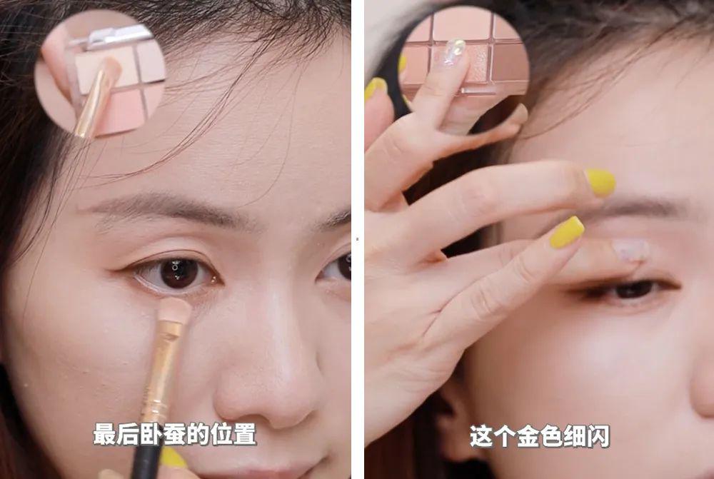 终末在卧蚕处扫上米白色的眼影,这不是为了画卧蚕, 而是为了让下眼影变得更干净;在上眼皮再肖似金色细闪,栽培统统眼妆的质感。