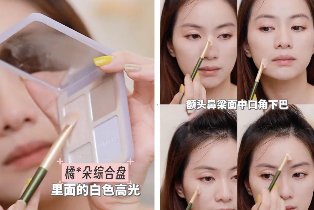 我会用到橘朵概括盘里的白色高光,扫一下 额头、鼻梁、面中庸利弊下巴,让妆容变得干净平整。