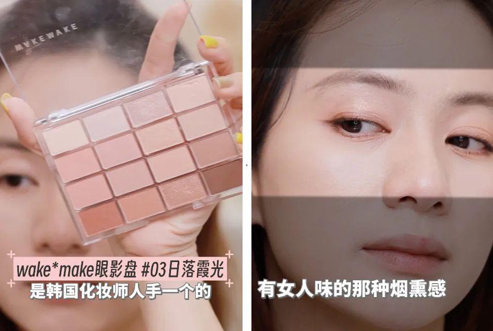 我用到的 是韩国化妆师东谈主手一个的wake make眼影盘#03日落霞光,平直把它最右边一列的脸色从上往下顺次叠涂一遍就好了。