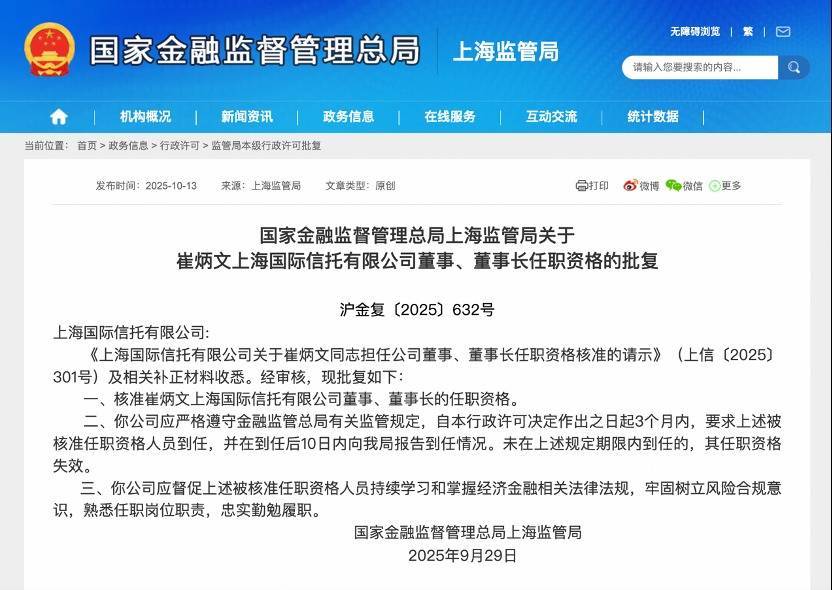 10月13日,国度金融监督责罚总局上海监管局发布批复,核准崔炳文上海相信董事、董事长的任职阅历。崔炳文现任浦发银行党委委员、副行长、总法律参谋人。